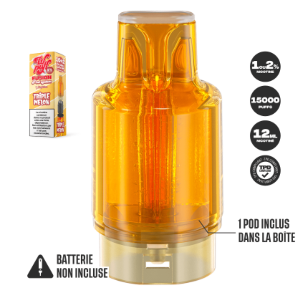 Découvrez les PODS Fusion Triple Melon : Un mélange fruité pour une explosion de douceur, recharges innovantes pour cigarette électronique offrant 15 000 puffs et 12 mL d’e-liquide. Disponibles en 1% et 2% de nicotine, elles intègrent un mesh coil de 1,2 Ω et une batterie rechargeable de 1750 mAh via USB-C, le tout conforme TPD.