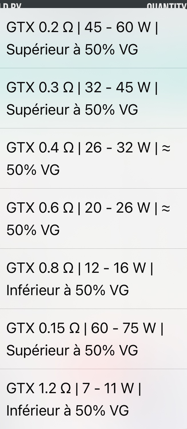 • GTX Mesh 0.2 Ω. À utiliser entre 45 et 60 watts. Pour une vape en inhalation directe puissante et une consommation élevée.